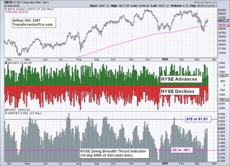 The NYSE ZBT Indicator did not move below .40 in mid March, but versions using the S&P 1500 and S&P 1500 did on March 13th. This means two things. First, the S&P 500 and S&P 1500 became oversold and ripe for a bounce. Second, a possible Zweig Breadth Thrust is setting up with March 27th as the cut off date.
