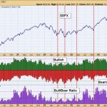 A value of .40 means the 10-day EMA is just 40%, which shows an extremely low percentage of advancing stocks. A value of .615 means the 10-day EMA is 61.5%, which shows an exceptionally large percentage of advancing stocks. For reference, the chart below shows NYSE Advances and Declines in the middle window and the ZBT indicator in the lower window.